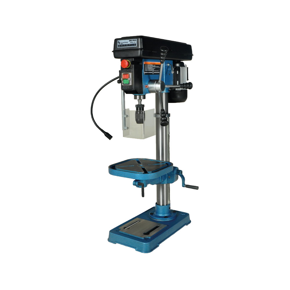 Professional-grade SCANTOOL 16AT V-belt driven drill press with advanced safety features, reversible spindle, and tilt-able working table for versatile workshop and industrial use.